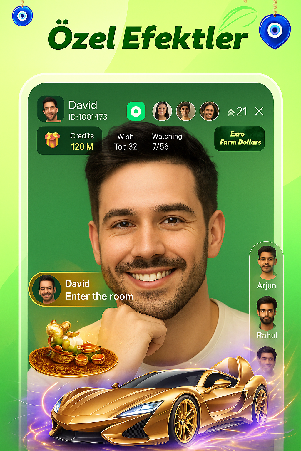 Canlı yayında altın araba, özel efektler, hediye animasyonları ve VIP rozetleri ile öne çık. Taka tarzı platformlarda prestijini artır, izleyicilerini büyüle ve gold hediyeleriyle popüler ol. Sahne senin, ışıklar senin üzerinde!